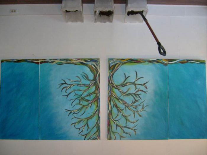 ‘Growth’ is juxtaposition of Nature and the view of Canada’s take on it. The piece is a tree somewhat symbolic of a gushing geyzer of oil. The quadtych is intentional and a mimic of the Canadian Flag. What are Canadians take of our environmental intelligence and conscience? How does that compare how the rest of the world sees us? Third World Nations see Canada as a wasteful country that is blessed with abundance of Natural Resources.