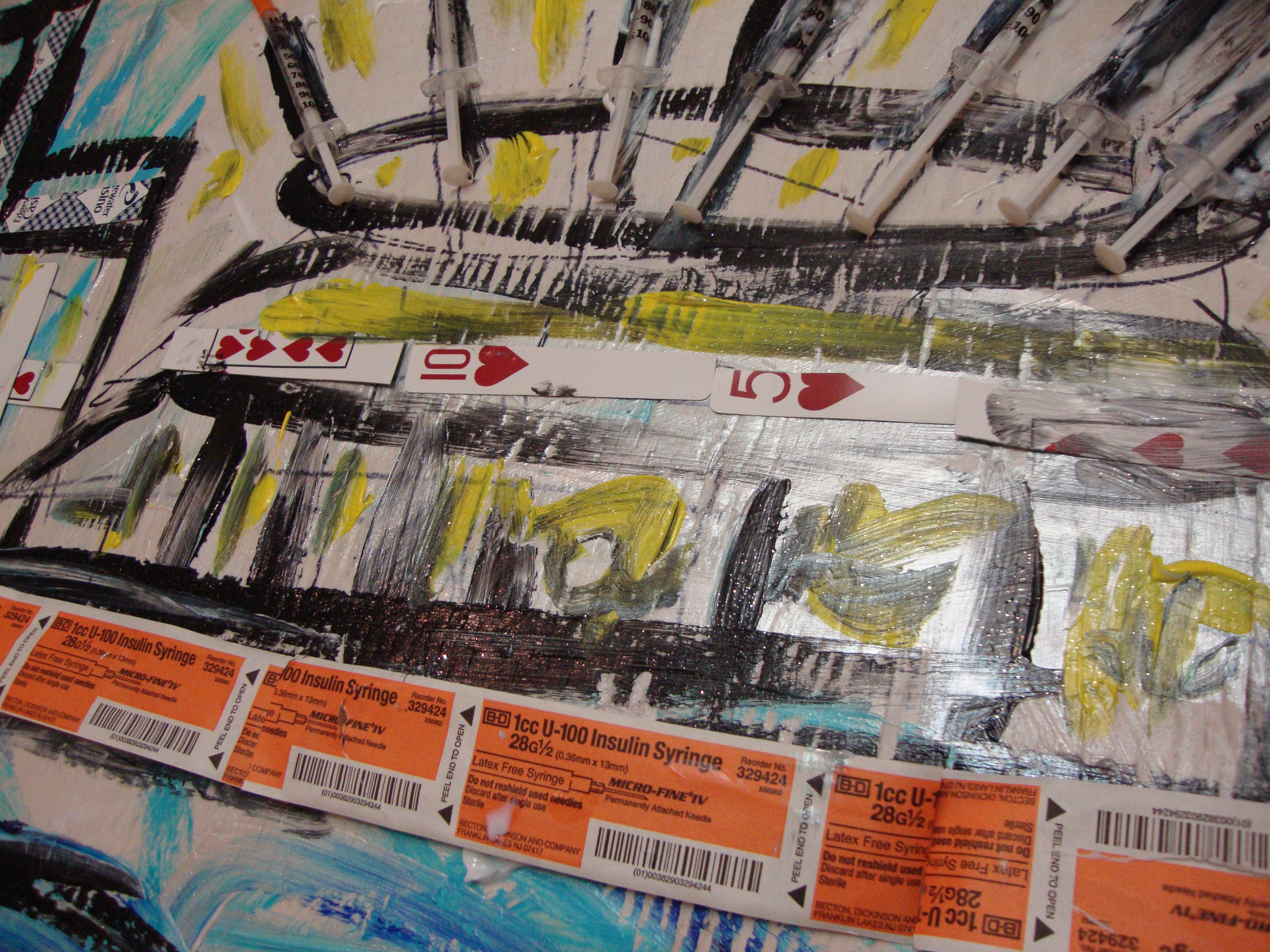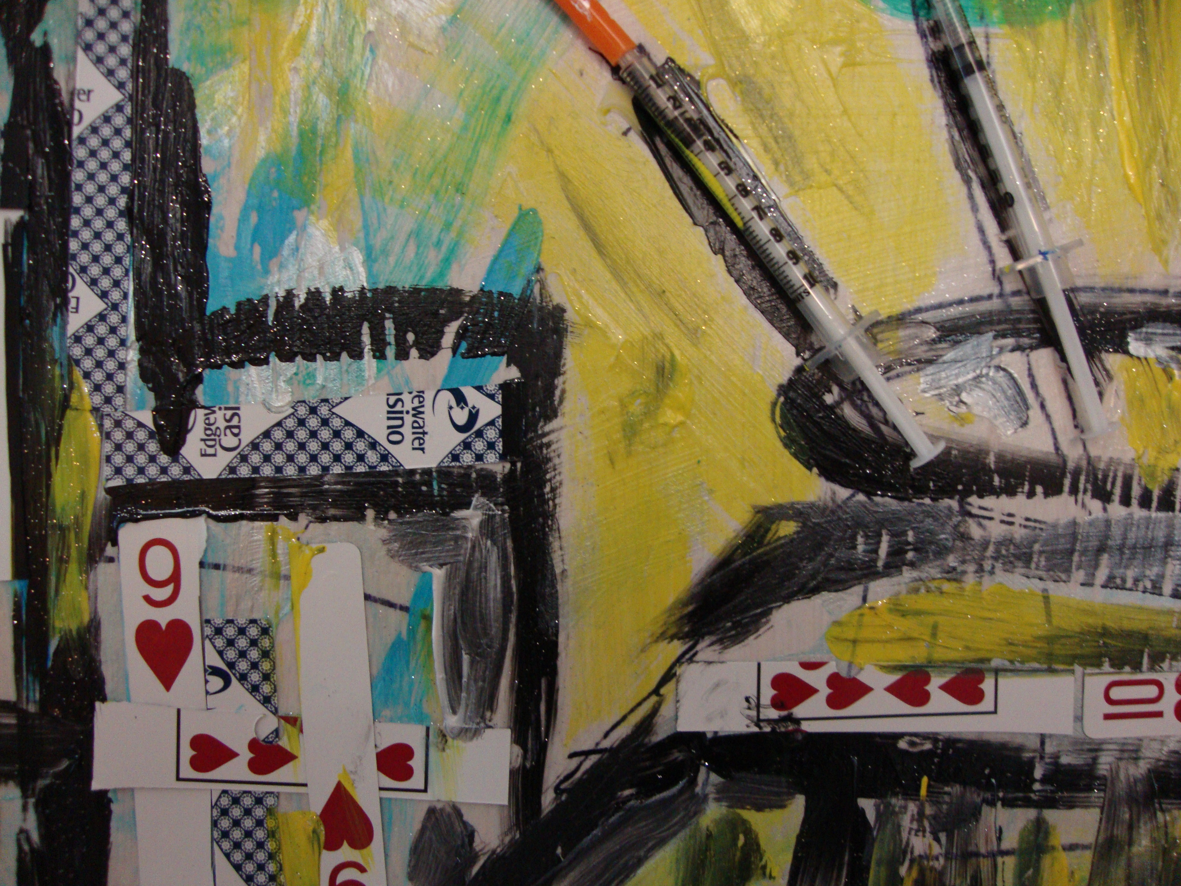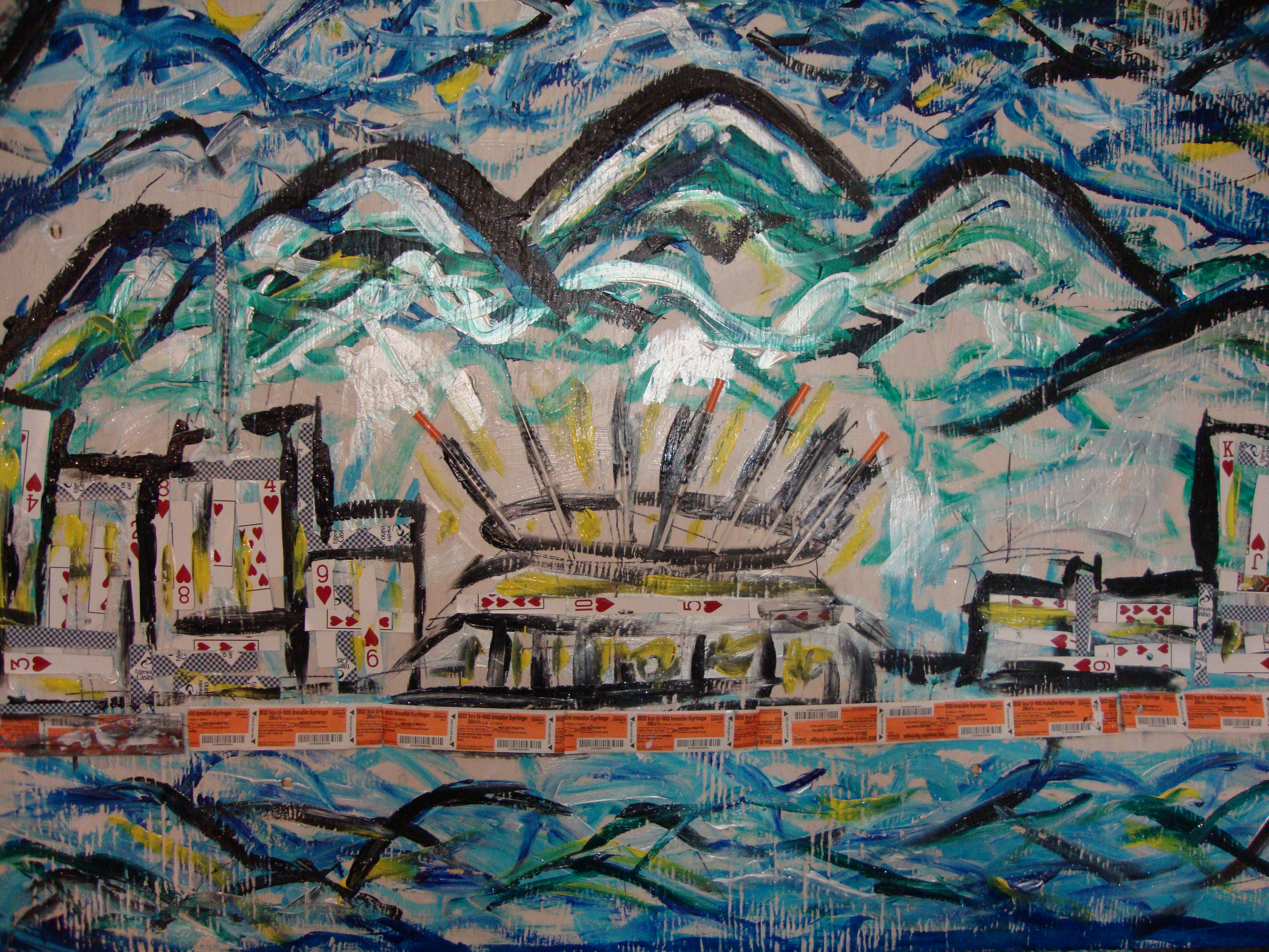 The piece called ‘Safety Zone’ is created with injection needles from InSite. When I approached them I offered to pay for the unused needles, they wouldn’t take my money but reminded me that the needles are for ‘Harm Reduction’, I said “I know”. Needles in the downtown Eastside of Vancouver have always been symbolic of addictions in the area. When I drove by the new Stadium under construction, the support structures looked like large needles to me. I began to think that Professional athletes and their high salaries are easy targets for addictions. Is a casino next door to the locker a high paying athlete good for the win/loss column of the team. In addition to gambling to casinos, there were other themes of addiction that I began to think about; ones which could be associated with the activities in the BC Place Gambling Zone.
