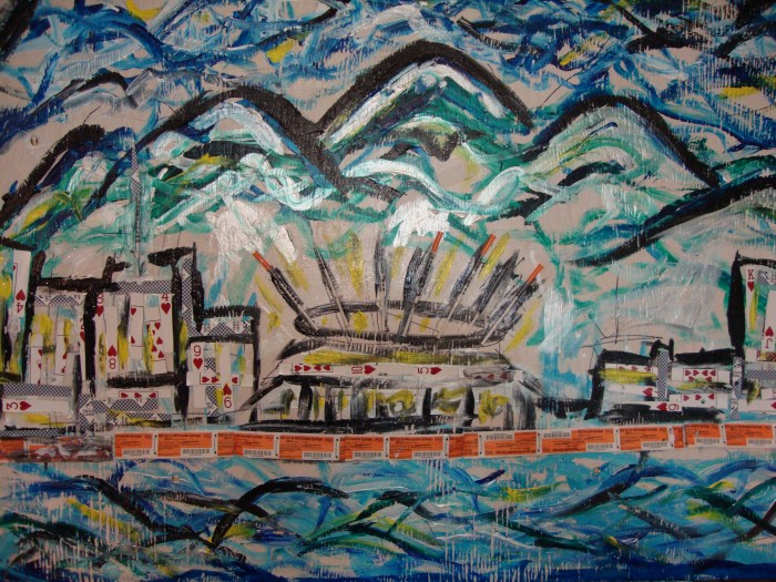 Sports: With the resulting Olympic Fever, our Government seems to associate anything exciting for our community, based entirely on the thrills of corporate sport. Our government even created a portfolio that linked sport with culture and community . Thus the resulting narrative: Sports makes everyone feel nice inside, lets do it again because everything else sucks. However, there are many people that take their addiction to sports to levels that create tensions in the household. Spending hundreds of dollars on sporting events, plastic trinkets, stuff and sports lotteries vs other household priorities or quality time with our families. Sports has a place in life, but I don’t think it should be everything. When the game is over do you feel depressed and lost, or can you just go on with your day to day life? The shredded up casino playing cards using only hearts in the deck symbolize that lost connection with loved ones, when sports or other addictions get out of hand.